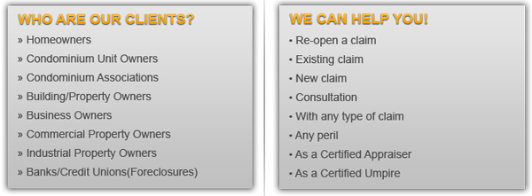 Our services will include performing the Free Evaluation; inform you of the duties after a loss, filing your claim, estimating your damages, adjusting your claim with the insurance company until settlement. We will keep you STRESS FREE; while we keep you informed every step of the claim process until a fair and reasonable settlement is reached with the insurance company.