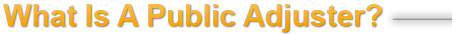 - Public Adjuster: is hired and works only for the best interest of the homeowner / property owner / business owner and is paid by them only when a settlement with the insurance company, has been obtained.